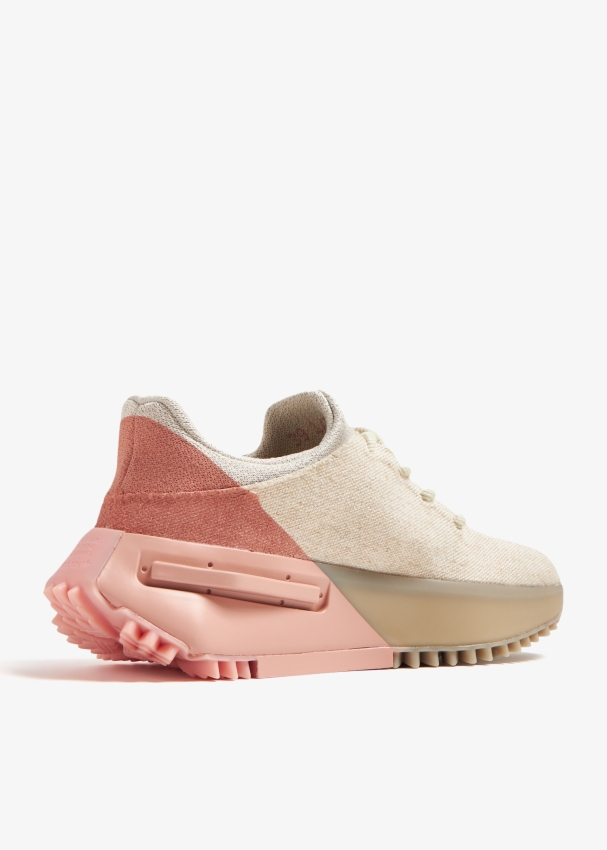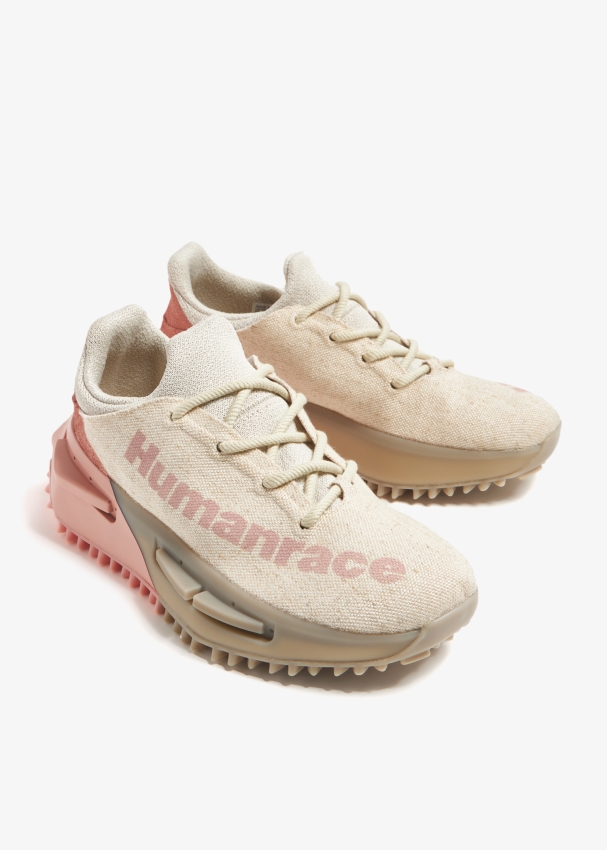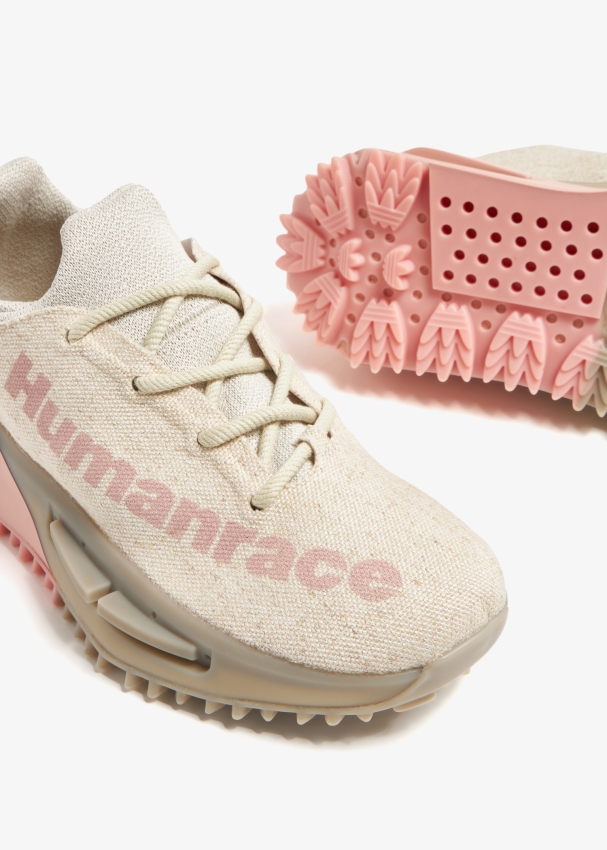 adidas and Pharrell Williams join forces once again to present a fresh take on the NMD S1 sneakers with this 'Oatmeal Pink' iteration. Updated in canvas with tonal laces and the Humanrace branding along the side, this low-top style features a soft textile tongue and lining and the signature plush BOOST cushioning with TPU plugs on the midsole.