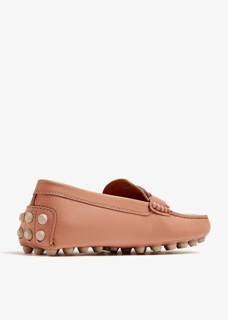 The Kate Gommino Bubble loafers offer a modern take on the classic rubber pebble design by Tod's. Expertly crafted, this refined version features a tone-on-tone chain accessory and is made from luxurious calfskin leather. It showcases the signature maxi rubber pebbles on both the outsole and heel for a distinctive touch.